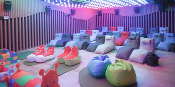 Dreamers at Shaw Theatres Balestier has been imagined with more play space – in fact the whole hall is a play space. There are no seats and only bean bag loungers with a full-body contoured design and high backrest. Made with premium sofa weave fabrics, you will be seated in weightless comfort throughout a screening. There are also mini kids-sized versions in the front row.