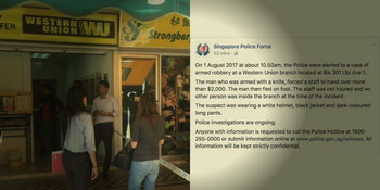 In a statement on Facebook, Singapore Police writes, “On 1 August 2017 at about 10.50am, the Police were alerted to a case of armed robbery at a Western Union branch located at Blk 301 Ubi Ave 1.