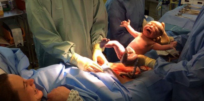“Do you want to give a push?” the surgeon jokes with Saunders as they witness a one-of-a-kind birth. “What?” she responds with a nervous giggle. The entire room also laughs nervously as the breathtaking “natural caesarean” occurs right before their eyes. The baby begins to cry as he struggles to “walk” out of the remainder of the womb, and the doctors begin to guide the courageous newborn through the rest of the way.