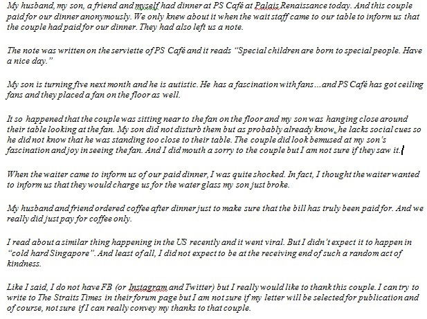 Wanjun and her husband, who have a 5-year-old son with autism, were out having dinner one day when they received a note from a couple who paid for their dinner. All the note said was: “Special children are born to special people. Have a nice day.”