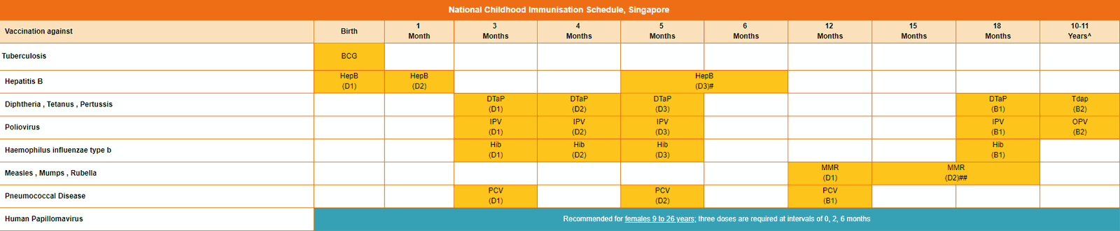 The vaccinations currently recommended to children in Singapore include:
