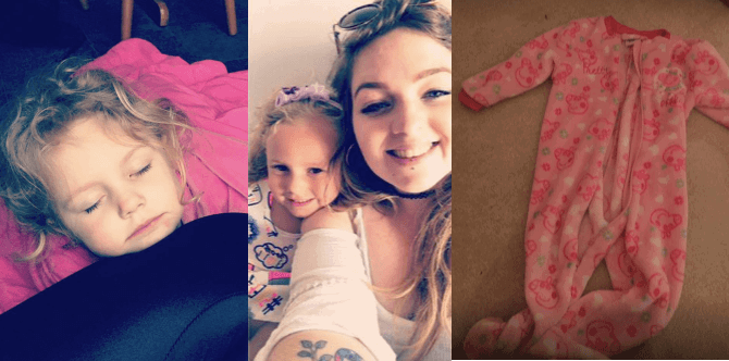 She elaborates: “She was so quiet in bed with me. I heard a weird noise and I turned around to her being choked by her onesie. The zip was too high on her neck and stopping her from breathing. She couldn’t even tell me or try to get my attention because she was suffocating! Thank god I noticed. She is a little shook up right now of course, but she is fine! Who would have thought a simple onesie could almost kill a child!”