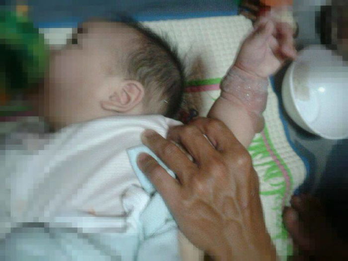 A close-up of the baby’s arm. You can see how blistered and painful-looking his skin is.