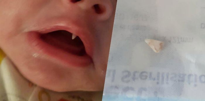 So, she decided to take him out. It was only after she changed him and was getting ready to feed him that she found the sharp tooth growing out of his mouth. It had grown overnight!