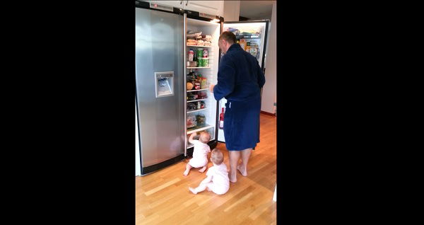 Ever wonder why dad is slow in the kitchen? He has two little rascals "helping" him out! Watch this video of baby twins help dad in kitchen!