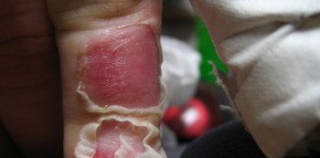 She held his hands under the 67-degree water for about 10 seconds, and when his hand turned very red, she put lotion and a sock over it.