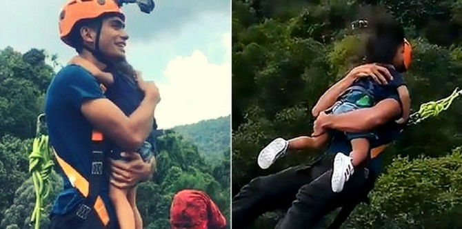 In the video, Malaysian reality television star Redha Rozlan is seen jumping off a 200ft-high bridge in Kuala Kuba Bharu. But he is not alone. Rozlan is with his two-year-old daughter Mecca Mikaela.