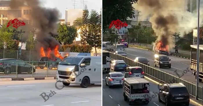 A mother and her son were quick to rush out of their car just moments before it catches fire in Singapore. The vehicle burst into flames outside Maris Stella High School along Bartley Road.