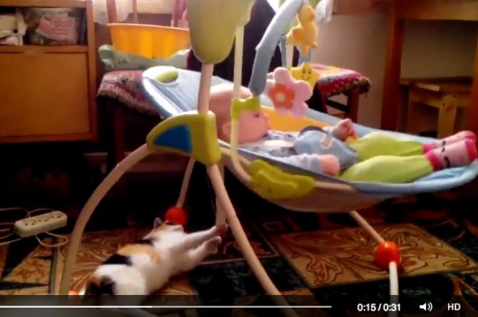 A cat keeps itself entertained and with a loose strap at the bottom of a baby's cradle. Watch what happens!