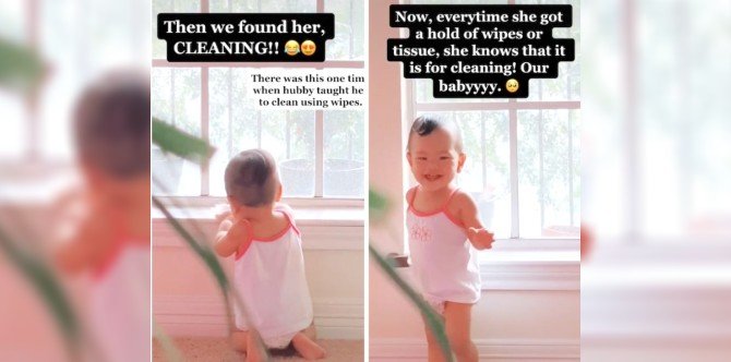 As Quacey wipes the windowsill with a wet wipe, a caption explains, “There was this one time when hubby taught her to clean using wipes… Now every time she gets a hold of wipes or tissue, she knows that it is for cleaning!”