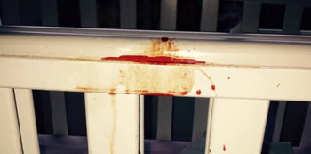 “These pictures show the blood left after my 11-month-old baby girl was injured by her cotbed bite guard,” Katie says on the post. “The blood pooled along the inside of the bite guard when she trapped her lip underneath it. This result in deep cuts and swelling.”