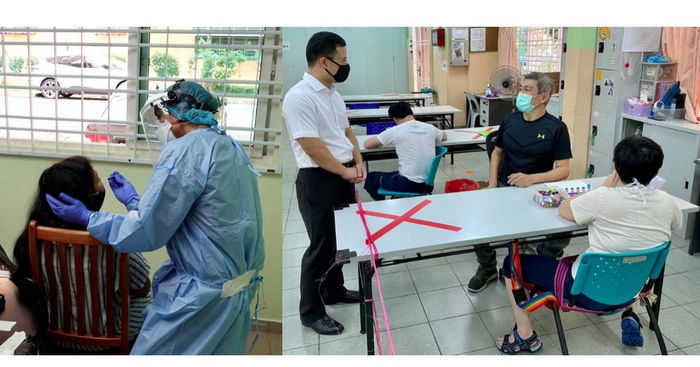 COVID-19 test being performed on staff at SUN-DAC disability centre at Choa Chu Kang. Photo: Minister Desmond Lee Facebook