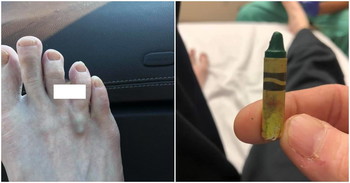 And that is what father of six, Jacob Brown, experienced in a bizarre accident where he had a crayon embedded between his toes after trying to kick it away.
