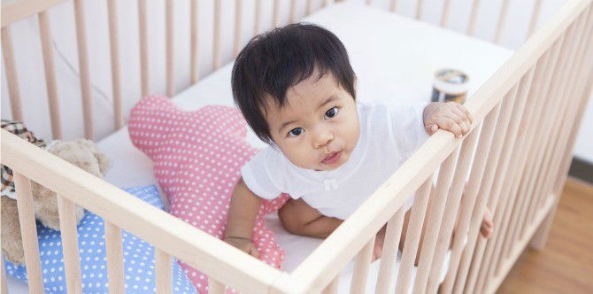 Firm mattress, less sheets and stuffed toys, and no bumper pads — your baby’s crib should have less stuff in it as much as possible. Soft couches, thick, flat sheets and toys may smother a baby in his sleep. When in the cot, place your baby in the ‘feet to foot’ position so there’s less chance of him slipping beneath the bedding.