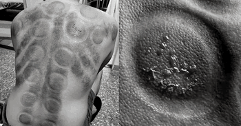 Around 16 circle shaped markings were observed on Rey’s back. The burns stretched beyond the red patches caused by the cupping which covered majority of his torso.