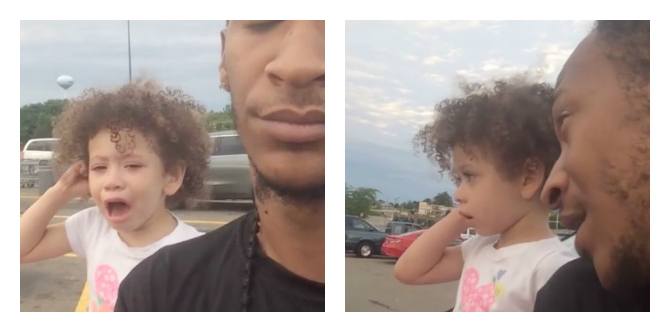 The video begins with the father-daughter duo in the parking lot. The daughter is crying as the onlookers pass by. The dad is not even looking at the daughter. He is filming the entire process, and the daughter knows it.