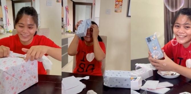 In the video, one can see the domestic help tearing up with joy as she continues to take out her gifts. And as she reaches the second box, she finds a few phone covers for her new phone.