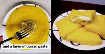 - It’s time to assemble your durian crepe. Add a spoonful each of whipped cream and durian paste to the centre of the crepe and fold in the corners to form a “pillow”, and you are done. Repeat the steps until you form all your durian crepes.