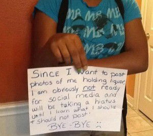 A picture of herself holding up a piece of paper with the words, “Since I want to post photos of me holding liquor, I am obviously not ready for social media and will be taking a hiatus until I learn what I should (and) should not post. Bye-bye.”