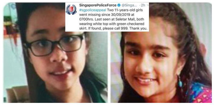 A case of 2 primary school girls missing in Singapore has sparked concerns. In a Twitter post on 30 September 2019, the Singapore Police Force revealed that: