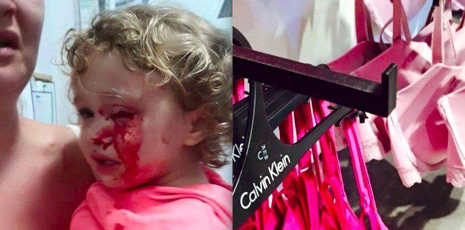 It shows a crying toddler whose face is streaked with blood coming out of her right eye. As it turns out, the little girl had run into a clothes rack while they were out shopping.