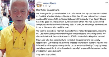Ms Chung also reminded Singaporeans to be “socially responsible”, and said: “Our dad did not travel to affected countries or clusters. How he was infected, is still a mystery to my family. Let us remember Daddy Chung by being socially responsible.”
