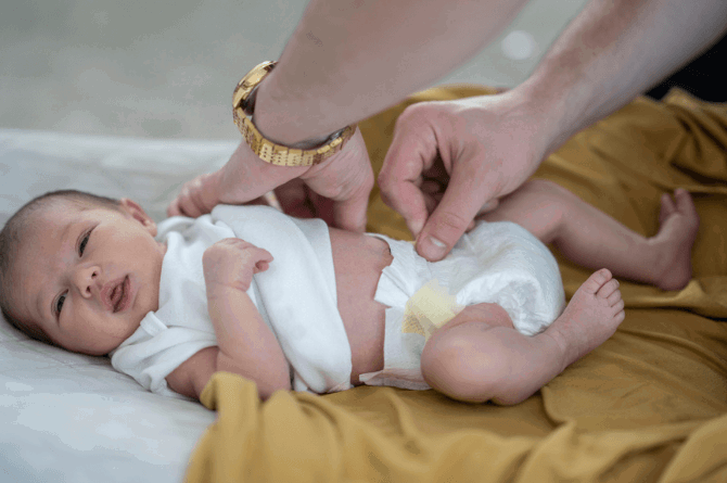 - Slide the diaper away and place it nearby, out of the reach of your baby.