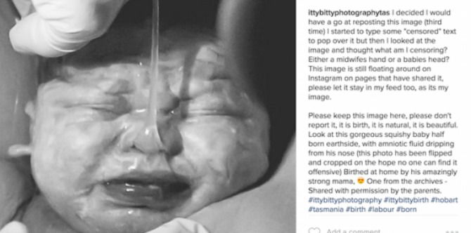 “I uploaded the image four weeks ago with the caption, ‘Look at this gorgeous, squishy baby half born earth side, with amniotic fluid dripping from his nose (this photo has been flipped and cropped in the hope no one can find this offensive),” she said.