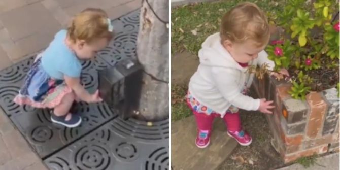 Mum Katie Lightfoot shared the video of her little girl casually strolling up to electrical boxes, street lights and even differently-coloured bricks sticking out of walls and placing her hands underneath.