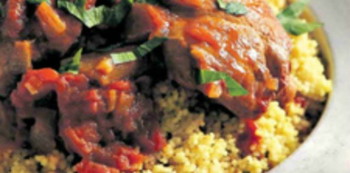 - To serve, place couscous on a serving platter and spoon the chicken stew on top. Garnish with chopped parsley.