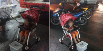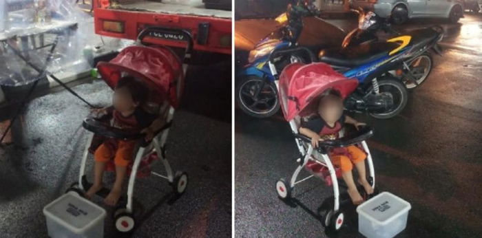 In the photos, the boy was placed in a stroller along the side of a road, with a plastic donation box in front of him. According to Awie, it was raining but the boy, who was barefooted, did not have any shelter or outerwear to keep him warm. The child’s parents were also nowhere to be seen.