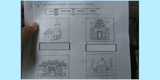 So, going by this worksheet, children had to ‘match’ the names ‘Devi, Hock Lee, Kamal and Steve’ to their respective places of worship. The ‘options’ for places of worship were church, Hindu temple, Chinese temple and mosque.