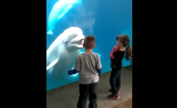 Watch this video of a playful beluga whale who pretends to lunge towards kids at the other side of the aquarium - and does it again!