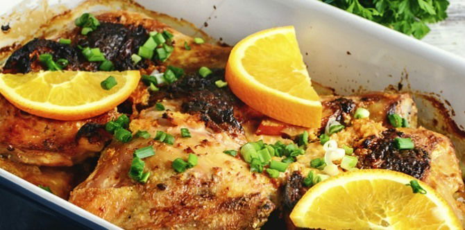 6. Remove from oven and place on serving plate. Pour the remaining sauce from tray over the chicken.