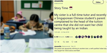 User @aborxmal recently wrote on Twitter, “My sister is a full-time tutor and recently a Singaporean Chinese student’s parent complained to the head of the tuition centre that she did not want her child being taught by an Indian.”