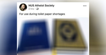 A screengrab of NUS Atheist Society’s post showed a picture of the Bible and the Quran, along with the caption: “For use during toilet paper shortages.”
