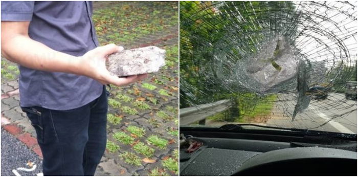In Singapore, in 2016, a GrabCar driver was taking a passenger to Clementi Camp on the AYE, when a rock smashed through his windscreen. The rock shattered the passenger side of the windscreen, leaving a hole where it landed and bits of glass all over the front passenger seat. Thankfully, the passenger had been sitting in the rear seat.