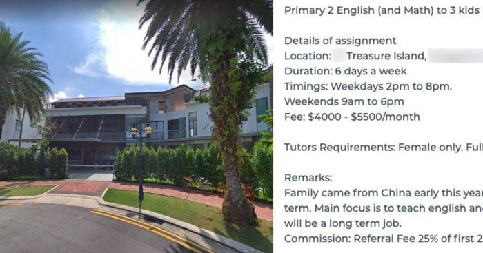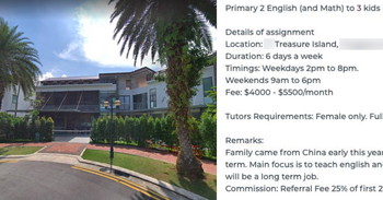 The details furnished on the ad were simple — $4,000 to $5,500 a month for a full-time tutor for three Primary 3 school kids at the family’s home in Sentosa. Oh, and only females may apply, according to the WhatsApp message, although the reason for why wasn’t stated. The message also stated that the family “came from China early this year”.