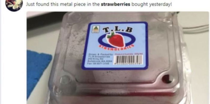 On September 19, Twitter user Dennis Tang shared a picture which shows a strip of metal which he said he found inside a pack of strawberries he bought the previous day.