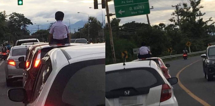 It was a sight that made drivers’ blood run cold — a boy perched on top of a moving car.