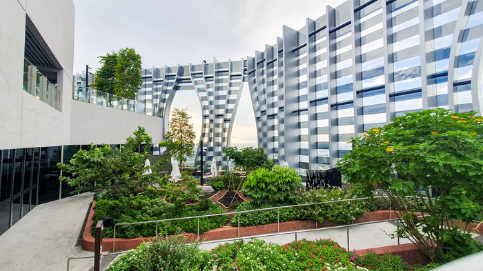 Singapore – View of Sky Garden at CapitaSpring Building. It is rooftop observation deck with variety of plants which offers view of Singapore Central Business District