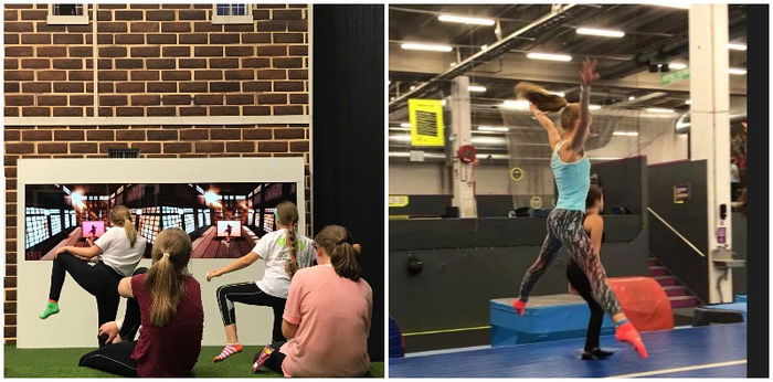 Another activity involves jumping on the trampoline to navigate the various levels of a game on a digital screen. Even a simple rock climbing wall has integrated digital aspects to make it more challenging!