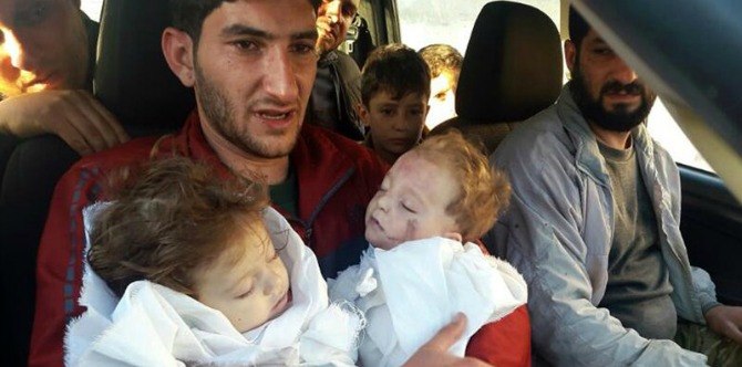 A father cradles the lifeless bodies of his cherubic twin babies who look like they could just be sleeping, but are in fact, dead.
