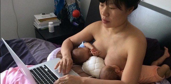 As you can see in the photo shown above, this mommy is a master of multitasking. As she works diligently on her laptop, she’s shown to be tandem-breastfeeding her (then) 5-week-old twins!