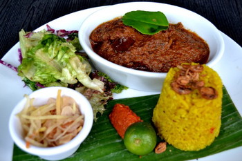 Fragrant Nasi Kuning, a traditional Indonesian rice dish cooked with coconut milk and turmeric, and atchara complement the rendang perfectly, making it a truly memorable dish.