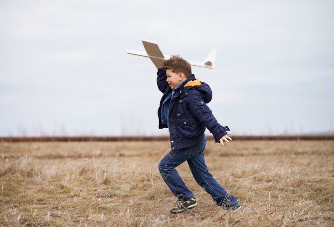 Photo of happy kid playing with toy airplane outside